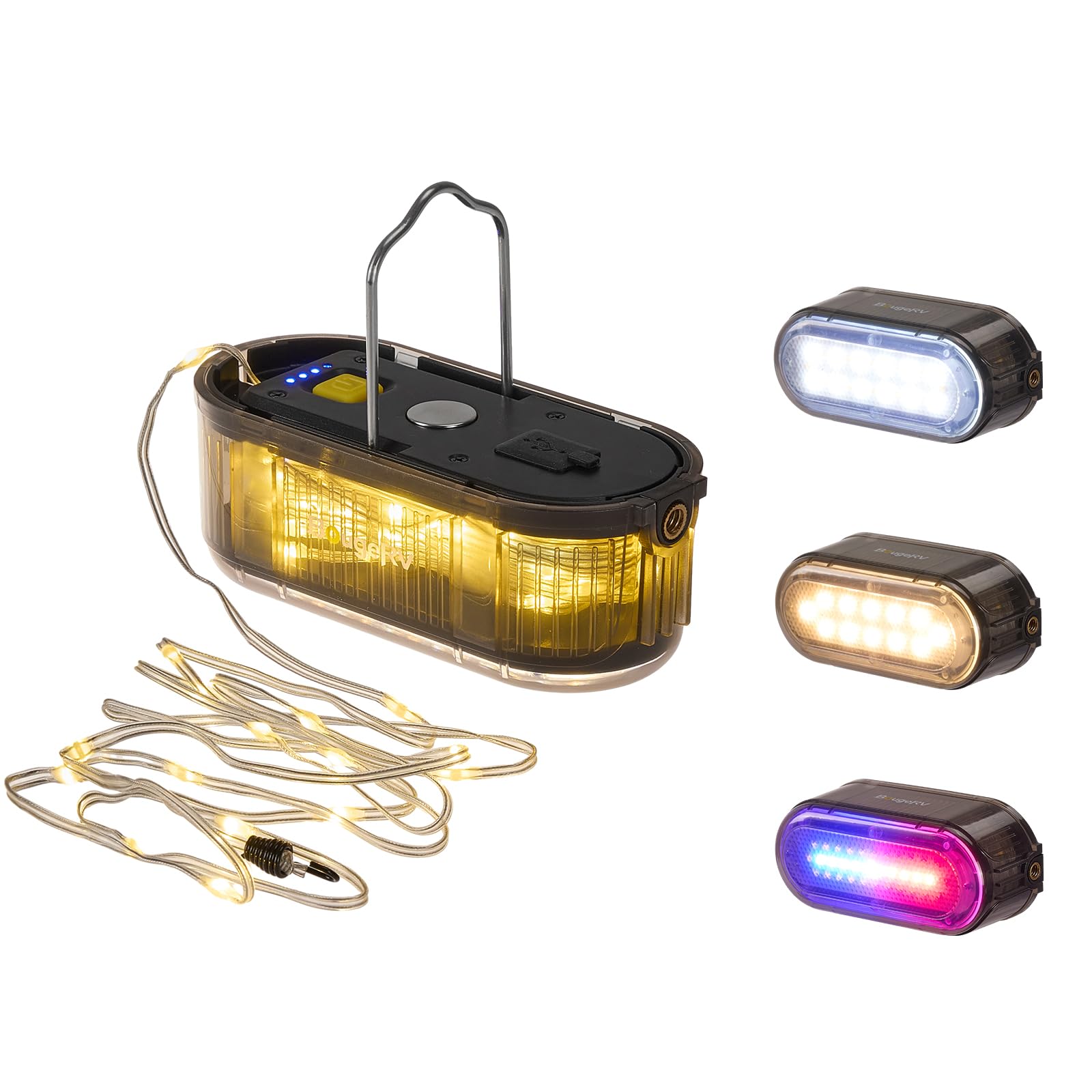 軽量コンパクトな設計でありながら、6.5mの伸縮可能なLEDストリングライトを内蔵した多機能キャンプランタン。